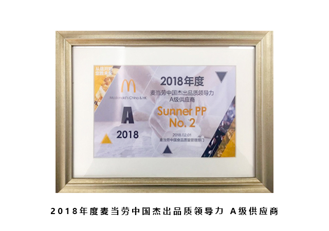 2月1日,上海虹桥绿地铂骊酒店,国际餐饮巨头所有产品品项及服务(包括:鸡肉、猪肉、牛肉、鱼肉、蔬菜、粉料酱料、甜品饮料、包材、物流、运营系统等)的数百供应商高管代表齐聚一堂,金拱门(中国)有限公司首席执行官张家茵女士携国际餐饮巨头供应链高管团队与所有供应商分享了国际餐饮巨头过去一年的成绩以及未来的愿景和展望。会上,作为中国本土鸡肉产品直供供应商——公司首次荣获“国际餐饮巨头中国杰出品质领导力 A级供应商”,旨在认同和表扬2017年公司在品质管理、生产管理、供应服务等方面的卓越成绩和突出贡献。傅芬芳总裁代表公司上台领奖。